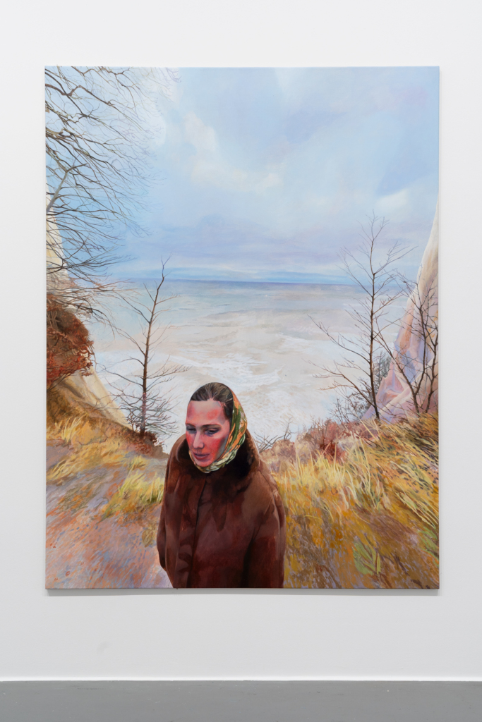 Die beiden nahezu identischen Selbstporträts vor den Kreidefelsen auf Rügen wirken auf den ersten Blick ruhig und vertraut. Eine Figur steht im Vordergrund der Landschaft, ihr Blick ist gesenkt, der Horizont offen. Die Szene erinnert an eine klassische Bildtradition der Kunstgeschichte, für die sakrale Naturerfahrung und romantisch-subjektive Empfindung zentral sind. Doch in Jailed First 1 und Jailed First 2 kippt diese Vertrautheit. Durch die Wiederholung unterläuft Olschowka den Anspruch des Einmaligen, das Selbstporträt verliert seine Stellung als singulärer Ausdruck und wird Teil einer vermeintlich seriellen Ordnung. Gleichzeitig dreht die Künstlerin die Figur von der kontemplativen Beobachtung des Meeres hin zur Betrachtung von etwas, das dem Betrachter außerhalb des Bildes verborgen bleibt. Die Aura des Originals erscheint somit nicht mehr als unveränderliche Eigenschaft, sondern als etwas Fragiles, das sich im Prozess der Reproduktion verändert.²