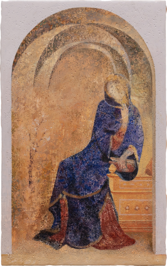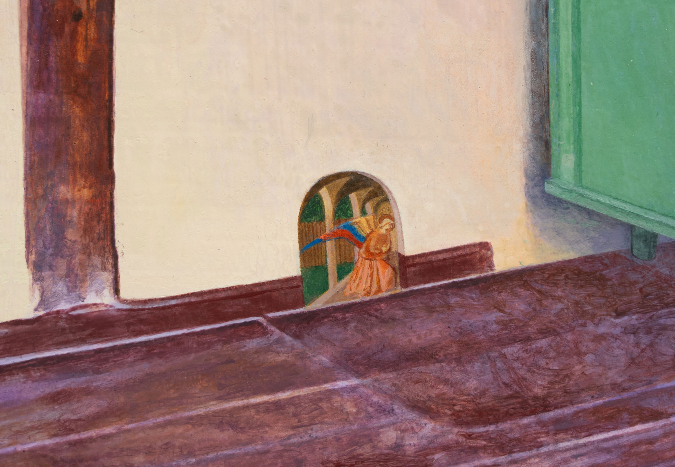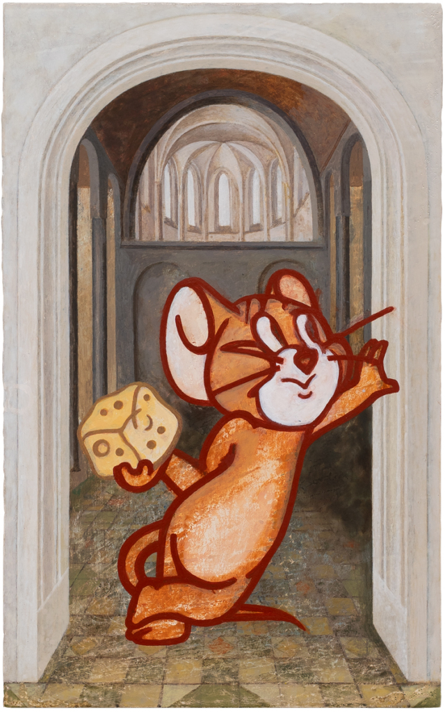 Diese Logik setzt sich in den Arbeiten Mäuseloch 1, Mäuseloch 2 und Get-together fort. Das Mäuseloch verändert Maßstäbe und unterläuft Hierarchien und Ordnungen. Simone Martini neben Jerry, die Maus – Olschowka stellt die Schwelle zwischen göttlicher und irdischer Sphäre, teilweise nüchtern, dar, indem sie Zeiten, Stile und Subjektpositionen überlagert. Das, was als wirklich wahrgenommen wird, ist abhängig von Kontext, Maßstab und Blick. Auch in der Arbeit S 285/1 wird diese Haltung sichtbar. Die Leinwand übernimmt exakt die Maße eines real existierenden Tisches von Marcel Breuer. Im Ausstellungsraum steht zusätzlich der echte Tisch, nicht als Werk, sondern als realer Gegenstand. Objekt und Repräsentation begegnen sich hier erneut ohne klare Hierarchie.